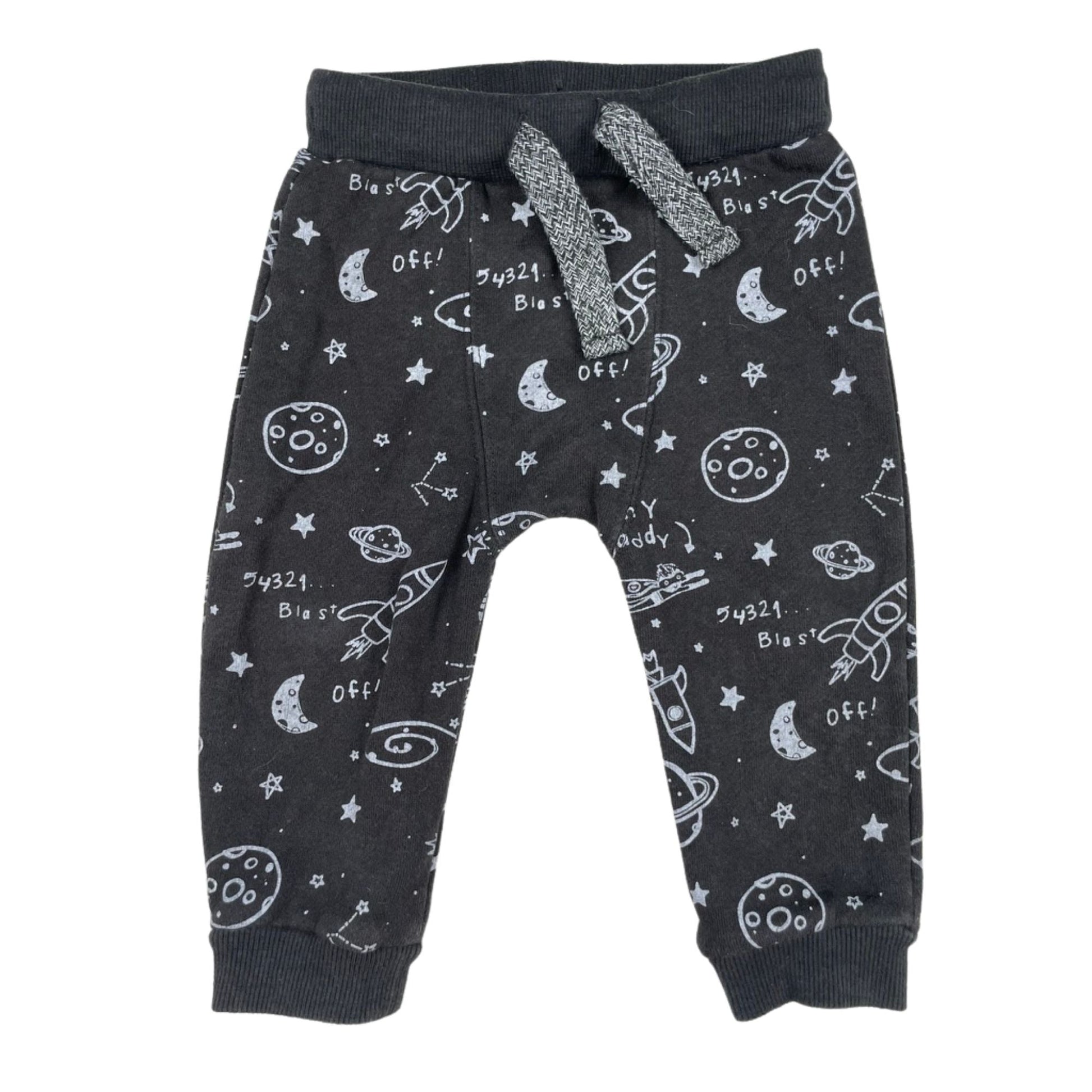 Weiche Baby-Jogginghose in Schwarz mit Weltraum-Print, Kordelzugbund und Rippbündchen . Secondhand in sehr gutem Zustand.