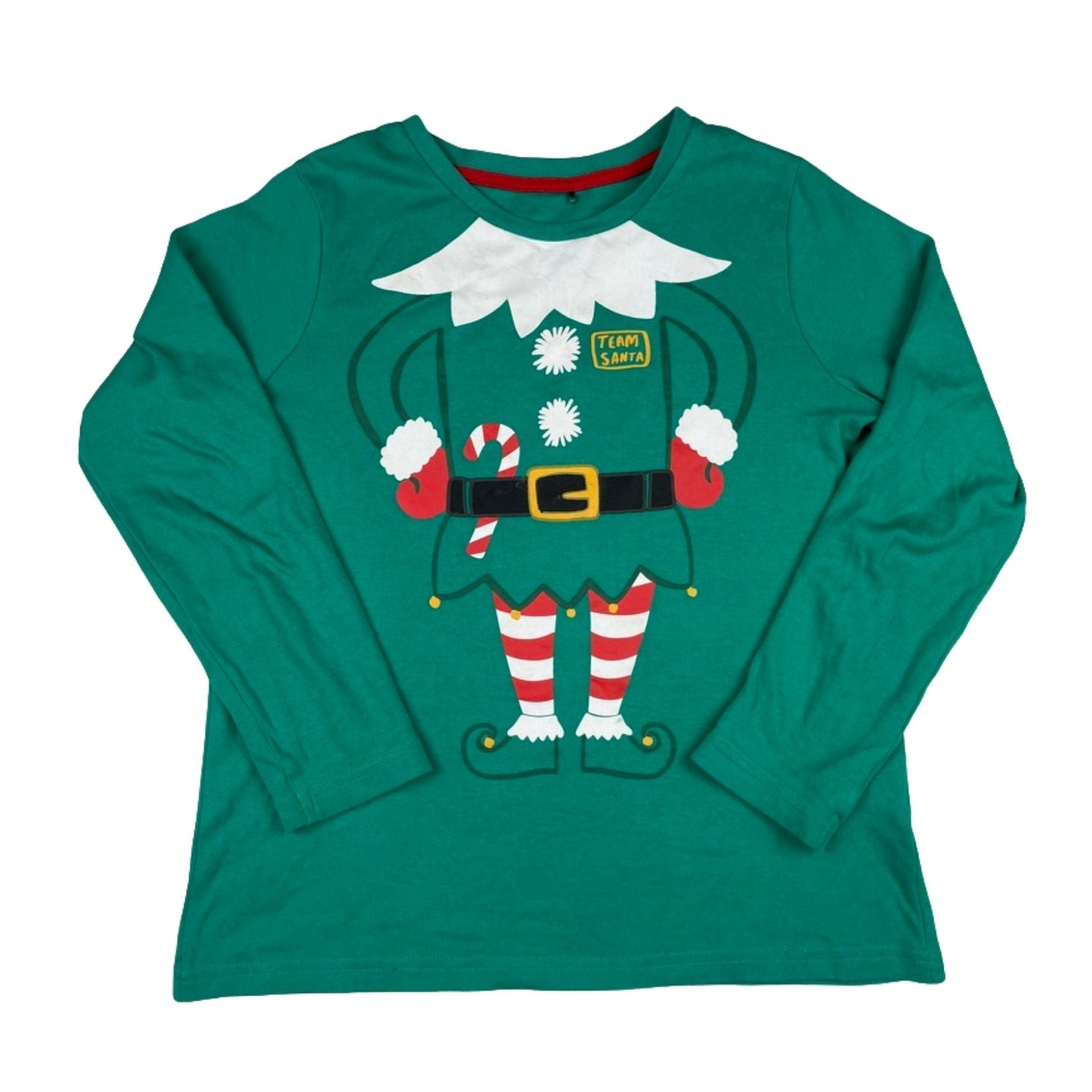 Grünes Langarmshirt mit weihnachtlichem Elf-Motiv – weich und bequem für die Feiertage.