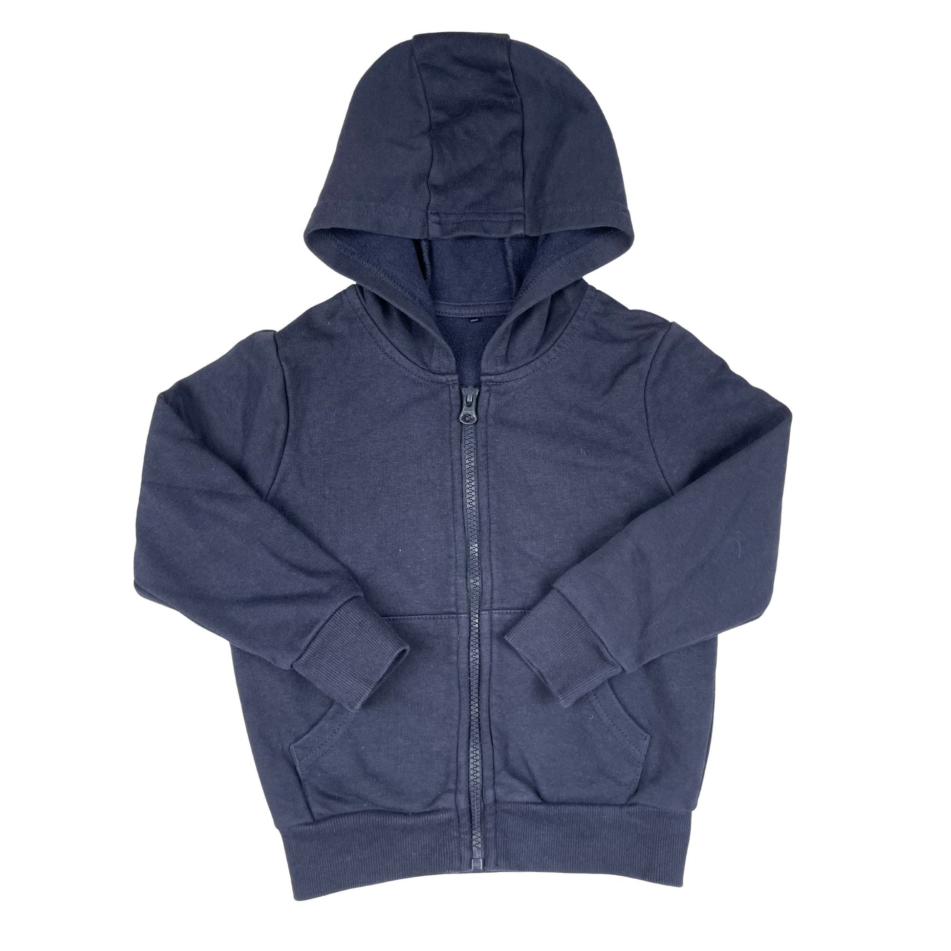 Weiche, dunkelblaue Kapuzenjacke mit Reißverschluss. Bequemer Alltagsbegleiter für Kindergarten und Spielplatz.