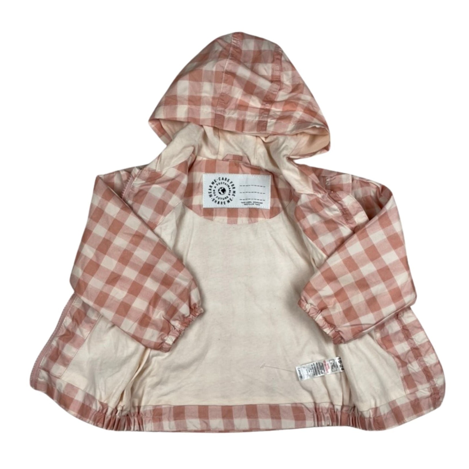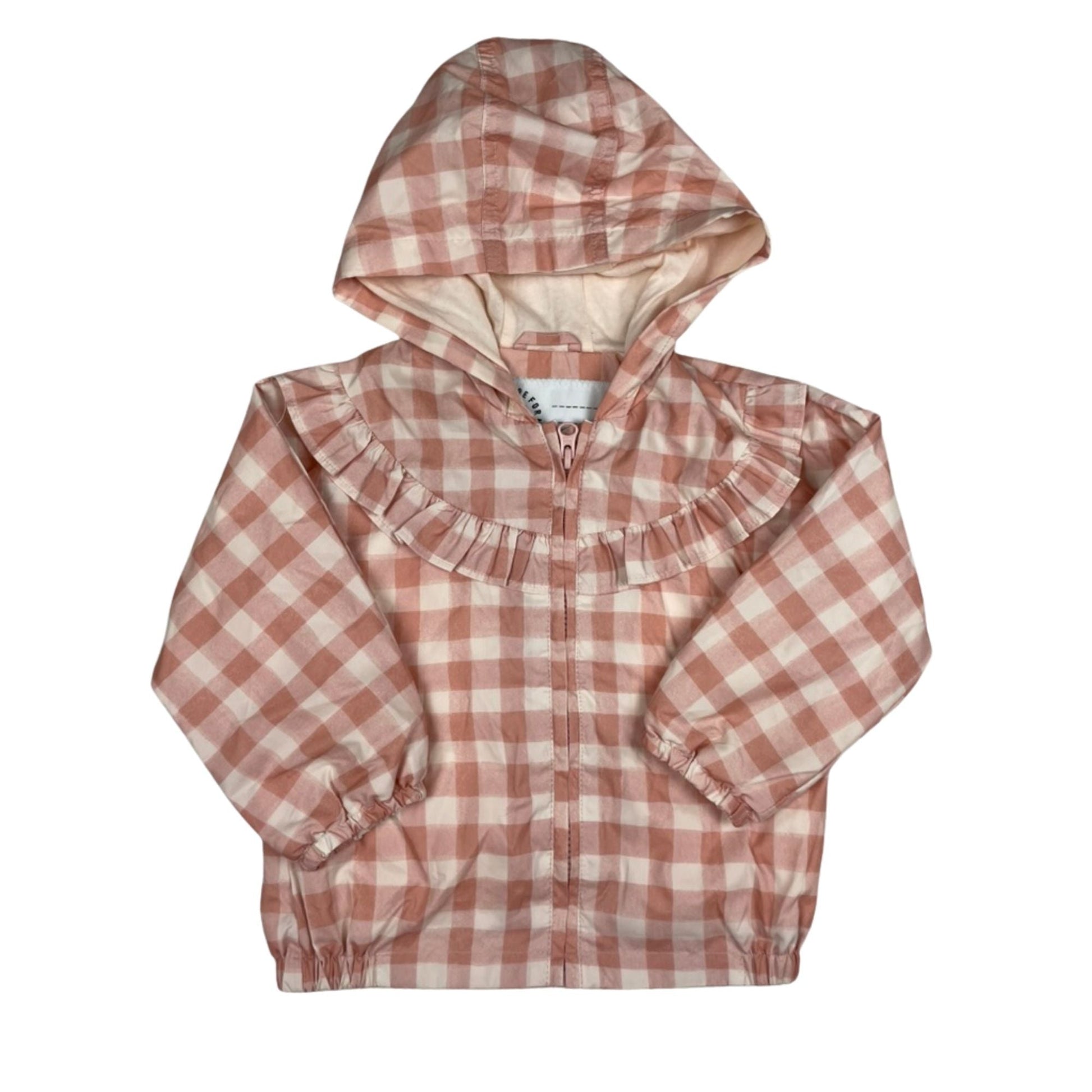 Zauberhafte Mädchenjacke mit rosa-weißem Karomuster. Besonderes Detail ist die verspielte Rüschenleiste auf der Vorderseite. Mit Kapuze und elastischen Bündchen für optimalen Sitz.