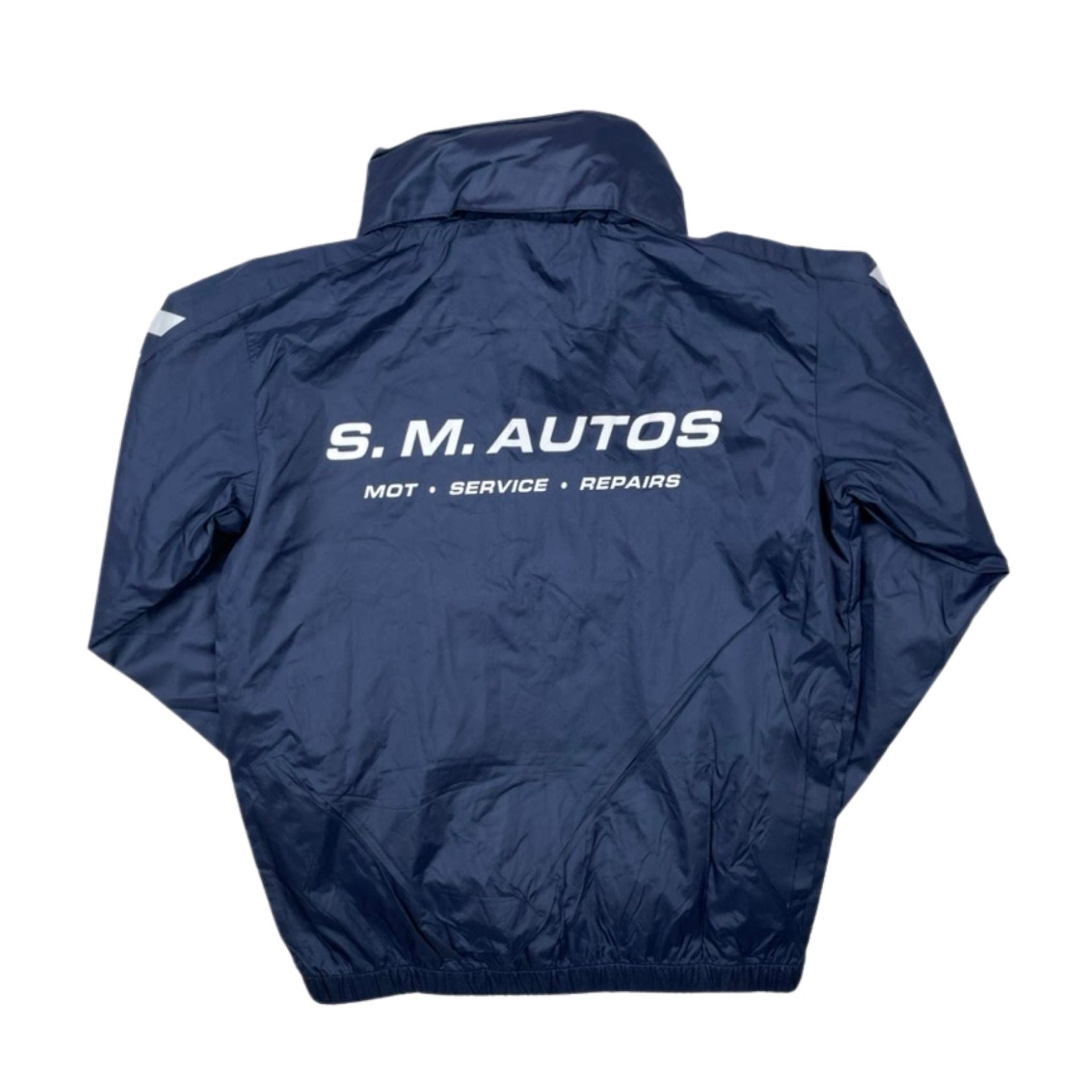 Diese sportliche Kinderjacke ist perfekt für aktive Tage. Sie kommt in einem klassischen Dunkelblau mit Vereinslogo und auffälligen weißen Details an den Ärmeln. Auf der Rückseite befindet sich der Aufdruck S.M. Autos – MOT, Service, Repairs.
