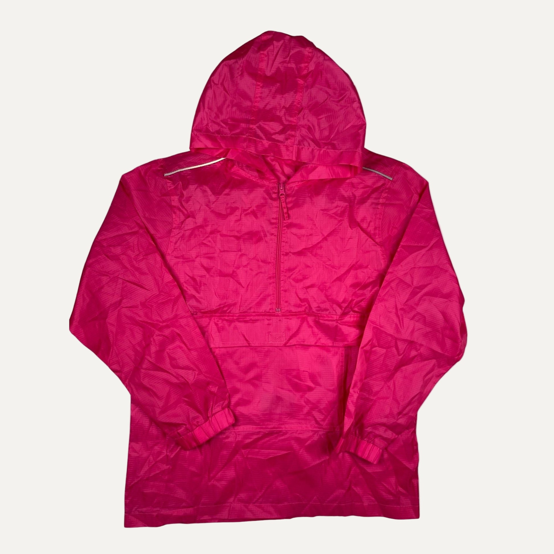 Leichter pinker Anorak mit Kapuze und Halbzip. Wasserabweisendes Polyester, mit Kängurutasche und elastischen Bündchen.